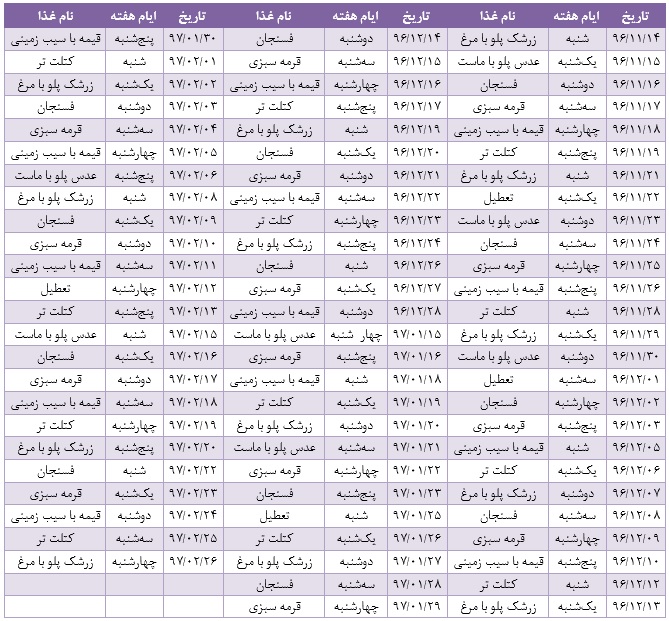 برنامه غذایی دانشجویان در نیمسال دوم سال تحصیلی ۹۶-۹۷ به شرح زیر میباشد: