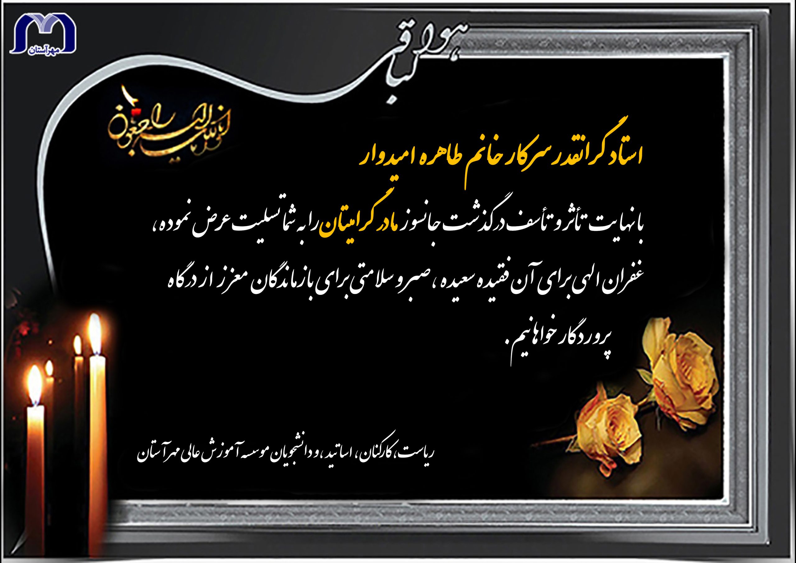 استاد گرانقدر سرکار خانم طاهره امیدوار، با نهایت تأثر و تأسف درگذشت جانسوز مادر گرامیتان را به شما تسلیت عرض نموده، غفران الهی برای آن فقیده سعیده، صبر و سلامتی برای بازماندگان معزز از درگاه پروردگار خواهانیم.