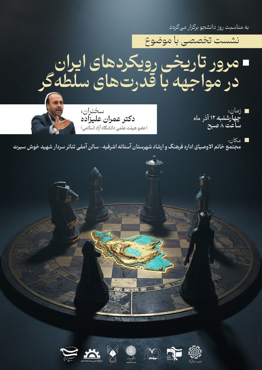 نشست تخصصی با موضوع مرور تاریخی رویکردهای ایران در مواجهه با قدرت‌های سلطه‌گر روز چهارشنبه ۱۲ آذرماه ۱۴۰۴ ساعت ۸ صبح در سالن آمفی تئاتر سردار شهید خوش‌سیرت مجتمع خاتم‌الانبیا اداره فرهنگ و ارشاد آستانه‌اشرفیه با سخنرانی دکتر عمران علیزاده (عضو هیئت علمی دانشگاه آزاد اسلامی) برگزار می‌گردد.